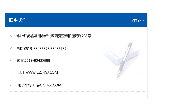 地址:常州市新北區友邦商務大廈1幢16、17層  電話:0519-85101652  傳真:0519-85112595  郵編:213022  網址:www.cz-jiayue_cn.maisuimall.com  郵箱:xiajifengaa@163.com